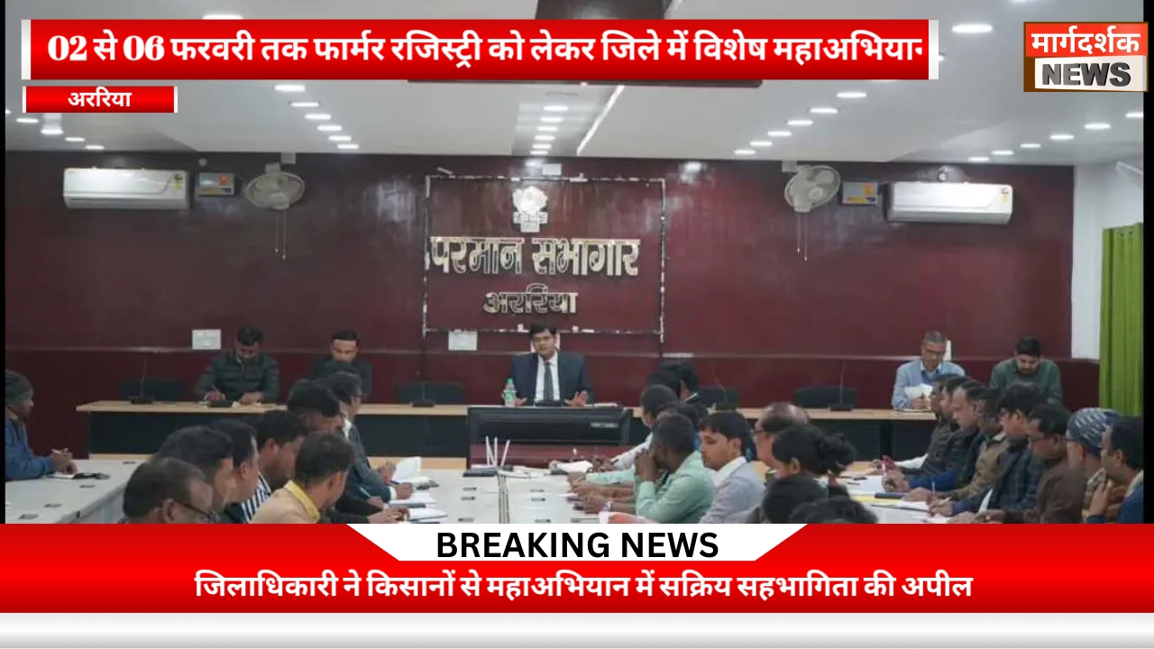 जिला पदाधिकारी अररिया श्री विनोद दूहन की अध्यक्षता में समाहरणालय स्थित परमान सभागर में शुक्रवार को आगामी 02 फरवरी से 06 फरवरी 2026 तक फार्मर रजिस्ट्री के विशेष महाअभियान की सफलता को लेकर संबंधित पदाधिकारी के साथ महत्वपूर्ण समीक्षा बैठक आयोजित की गई। साथ ही बैठक में अररिया जिला में चल रहे फार्मर रजिस्ट्री अभियान की प्रगति की विस्तृत समीक्षा की गई तथा शेष किसानों का पंजीकरण शीघ्र पूर्ण कराने के निर्देश दिए गए।