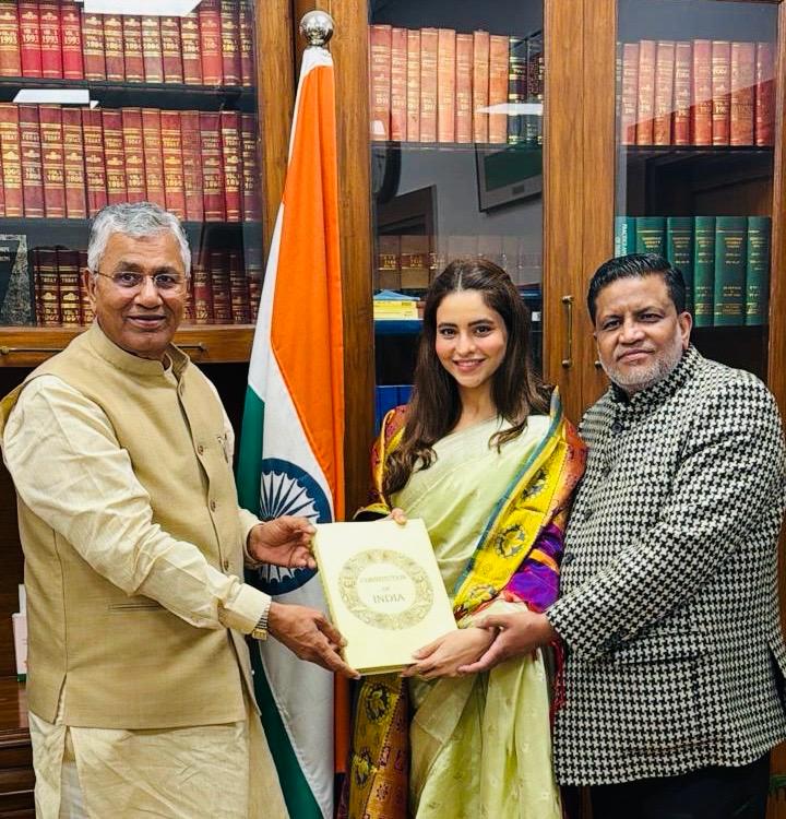 रिपोर्ट: रुद्र किंकर, मार्गदर्शक न्यूज, नई दिल्ली |वर्ल्ड पीस हार्मोनी के चेयरमैन जनाब हाजी डॉ. मो. शकील सैफी की अगुवाई में मायानगरी मुंबई से आए फिल्म और टीवी जगत के चर्चित चेहरे दिल्ली पहुंचे, जहां उन्होंने राजस्थान से लोकसभा सांसद एवं वर्ल्ड पीस हार्मोनी के संरक्षक प्रणव प्रकाश चौधरी से उनके आवास पर शिष्टाचार मुलाकात की। इस दौरान सांसद चौधरी ने सैफी सहित अभिनेत्री आमना शरीफ और फिल्म निर्माता निक्की भगनानी का अंगवस्त्र ओढ़ाकर तथा संविधान की पुस्तक भेंट कर भव्य सम्मान किया।